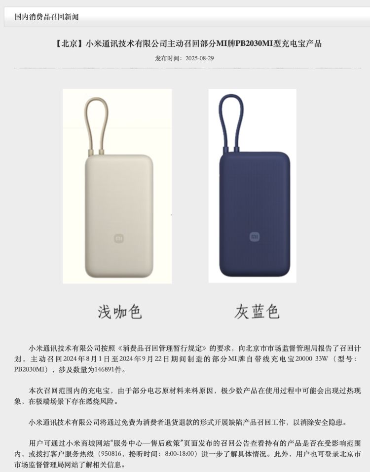 根据8月29日的召回信息,小米主动召回2024年8月1日至2024年9月22日期间制造的部分MI牌自带线充电宝20000 33W(型号:PB2030MI)。