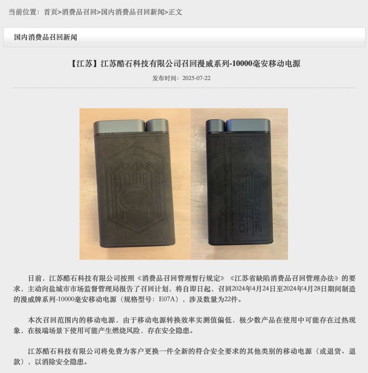 而7月22日的召回信息则显示,酷石召回2024年4月24日至2024年4月28日期间制造的漫威牌系列-10000毫安移动电源(规格型号:E07A),不过数量比较少,仅22件。
